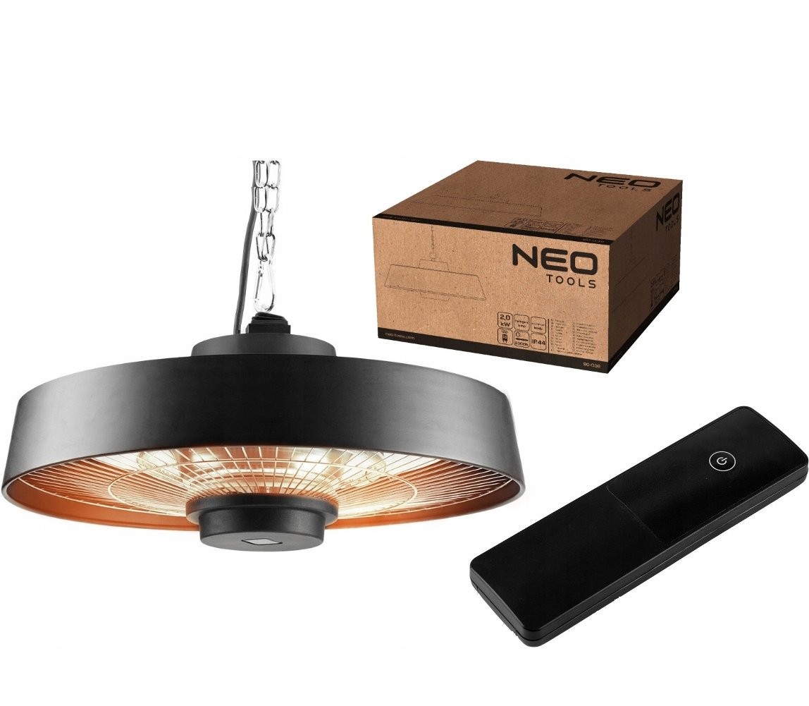 - Promiennik sufitowy 2000 W, aluminiowy, z pilotem, włącznik, element grzejny halogen lamp 90-038 marki NEO to urządzenie na podczerwień, które przetwarza energię elektryczną w ciepło.